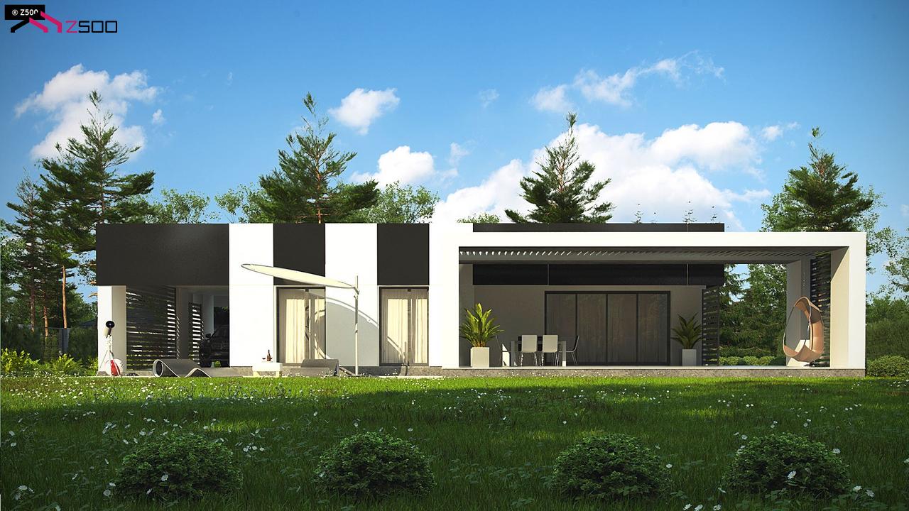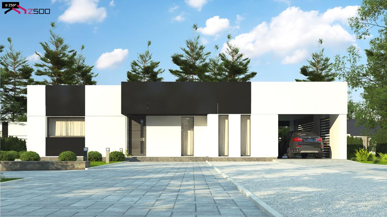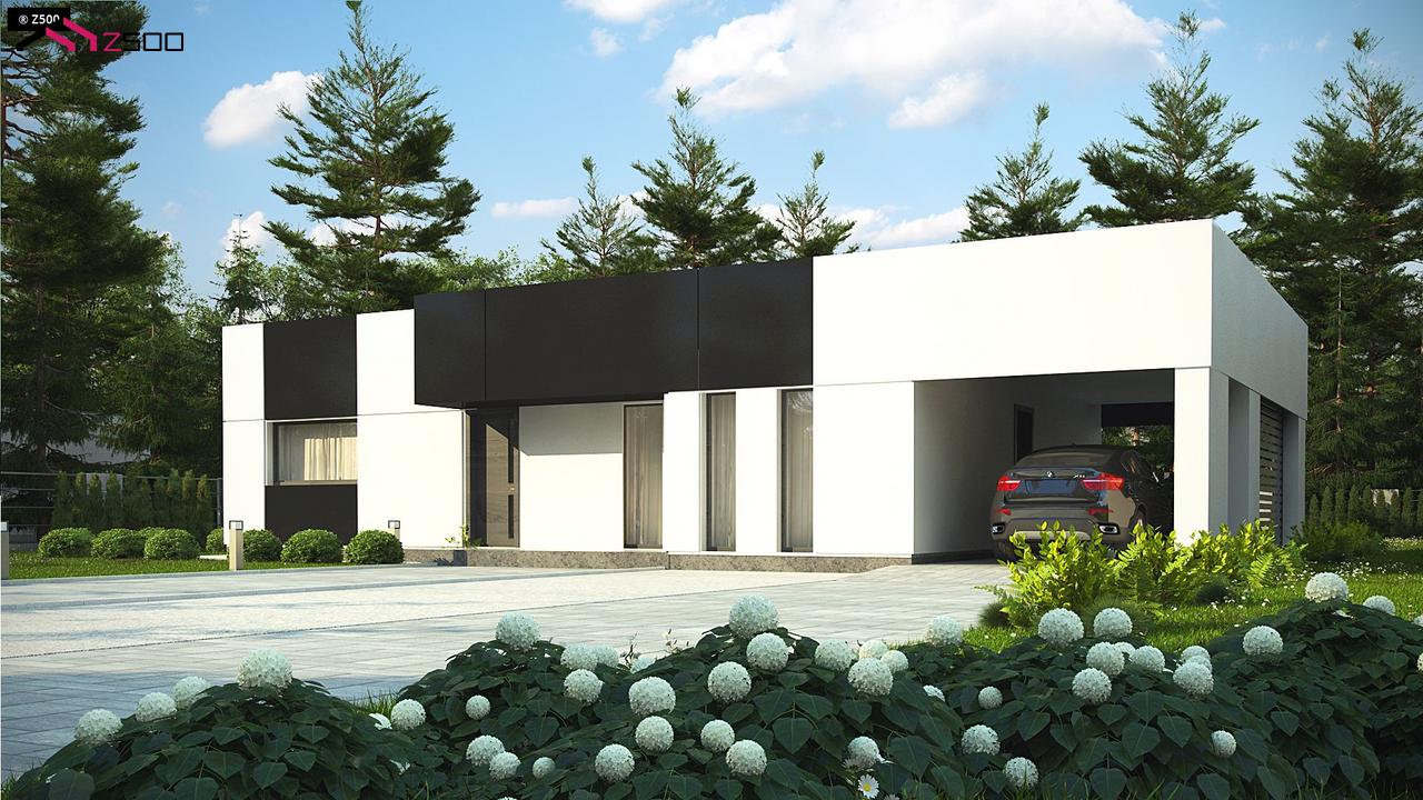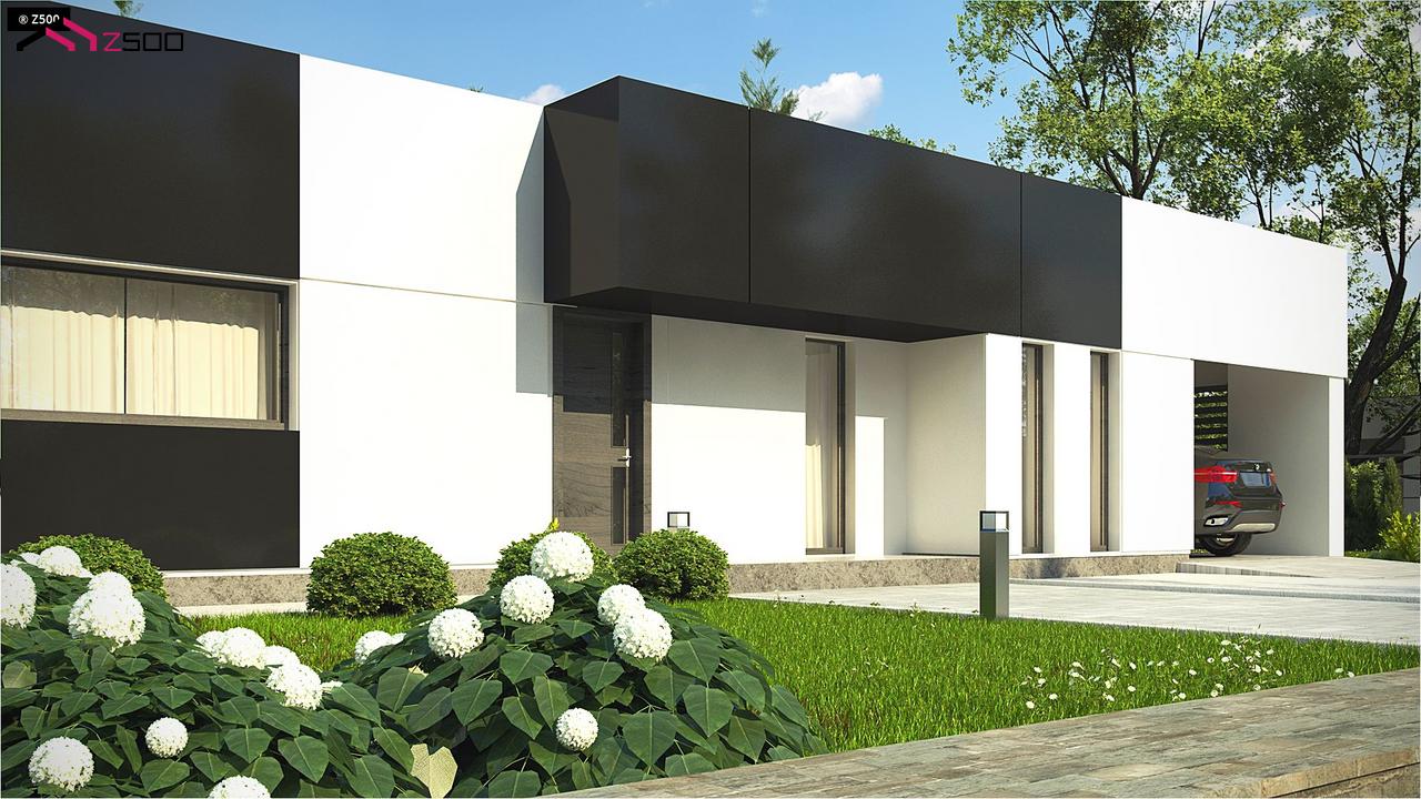 Проект современного одноэтажного дома с черно-белыми фасадами и открытым гаражом на 2 машины