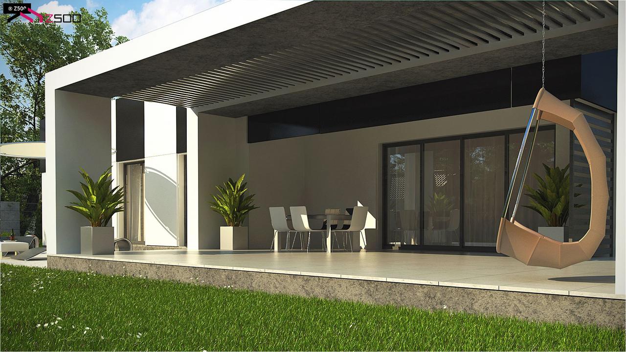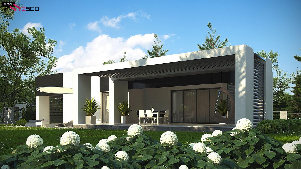 минимализм с плоской кровлей и открытым гаражом на 2 машины. Дом выглядит