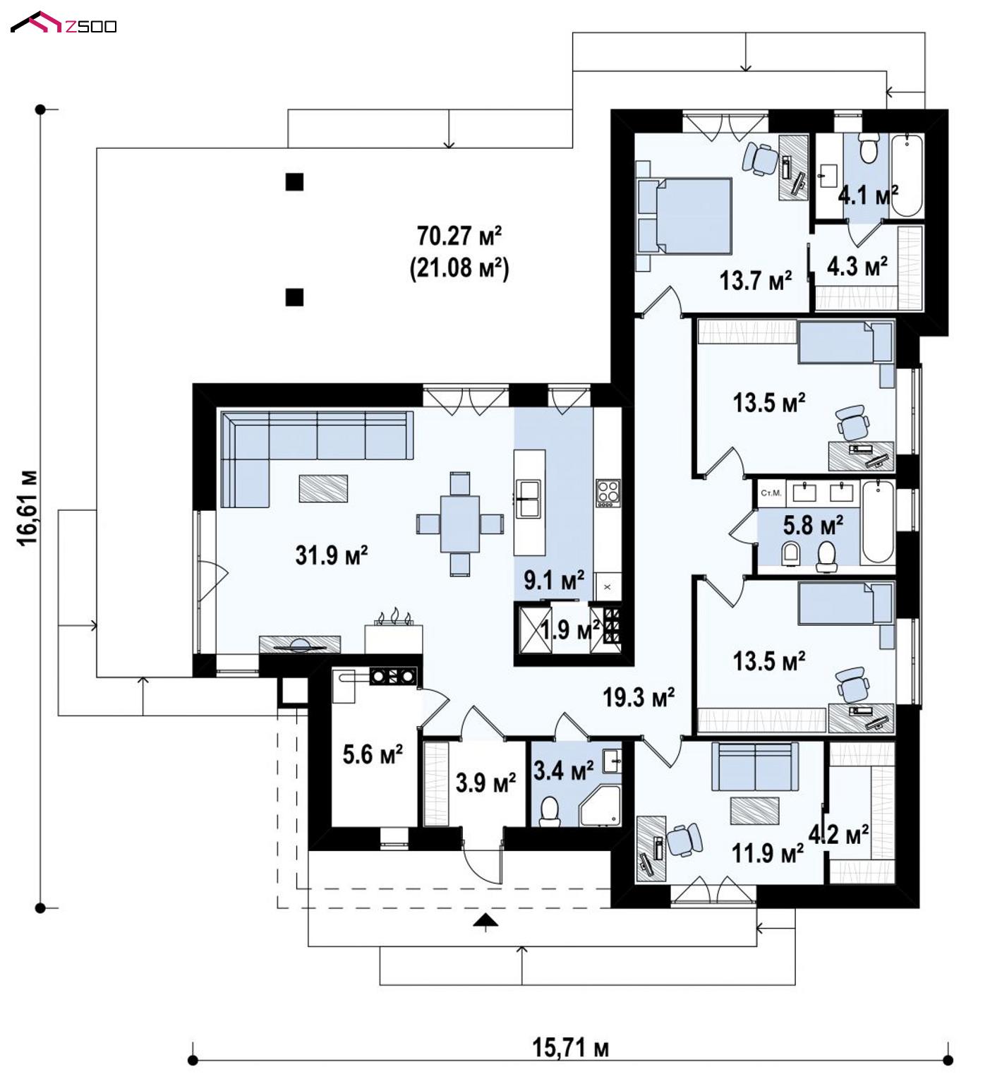 Проект Zx161 предназначен для ценителей современной архитектуры, функциональных планировок и комнат с большим количеством света.