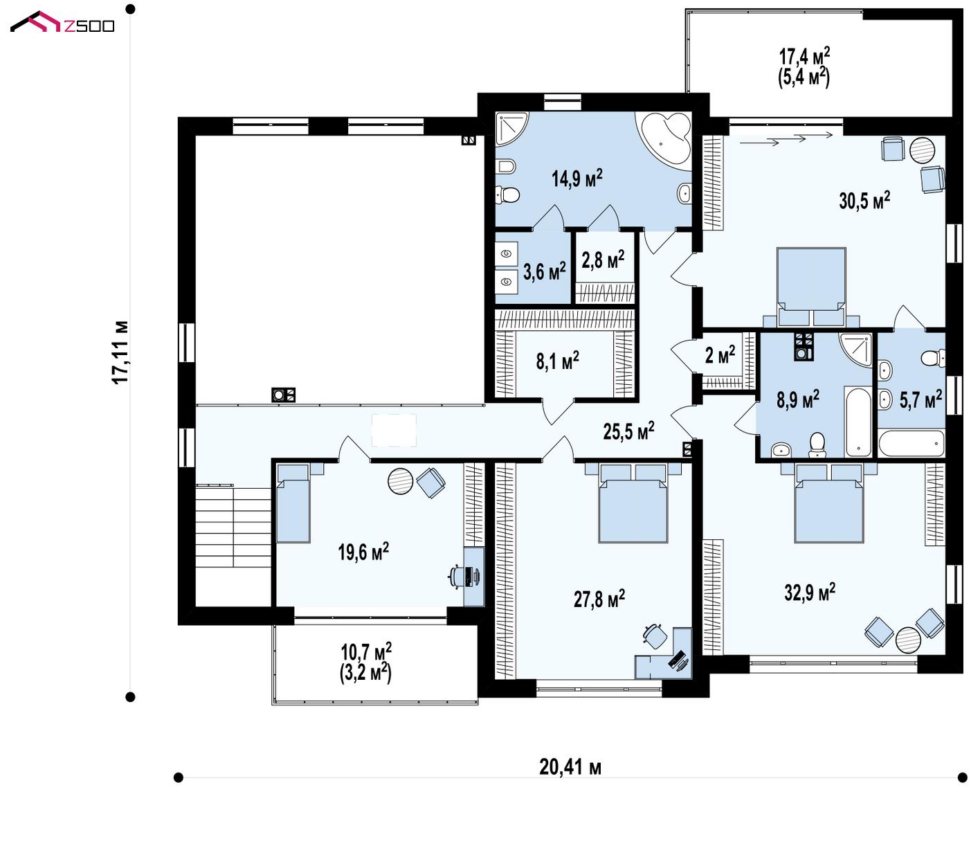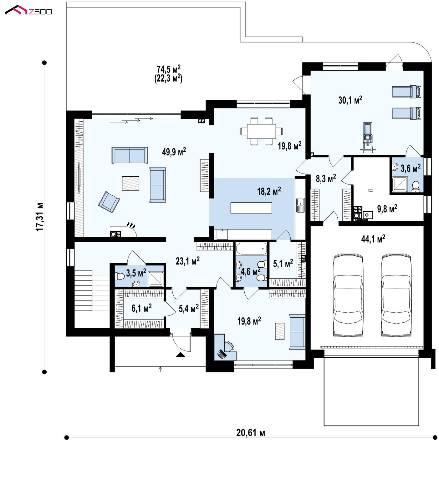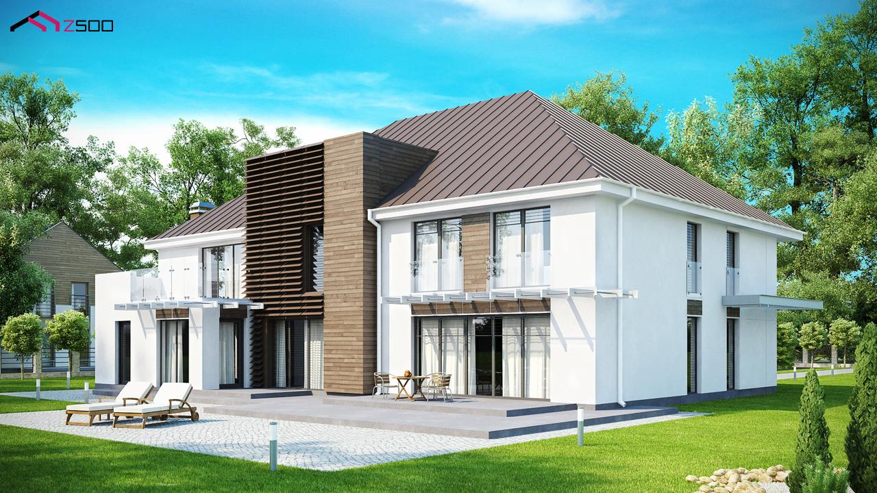 Проект Zx20 представляет роскошный современный особняк со вторым светом над гостиной. Броско оформленный фасад и крутой уклон крыши (35 градусов) придают дому стильный внешний вид.