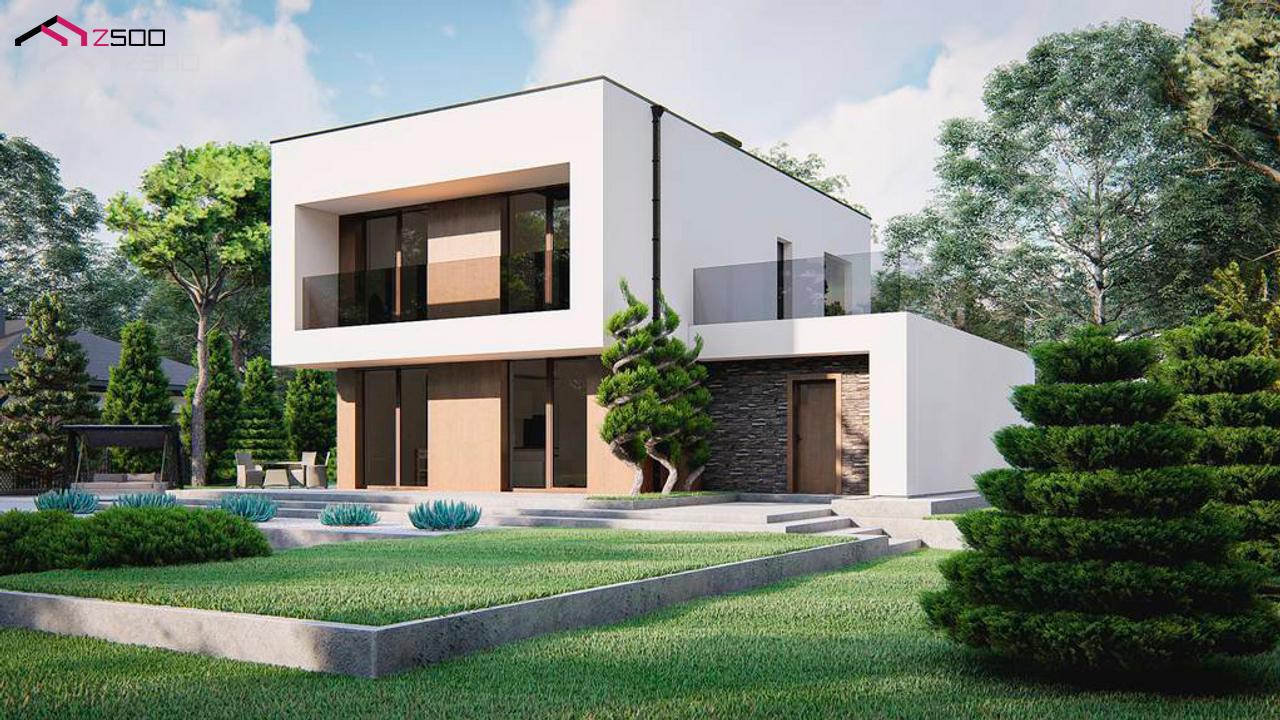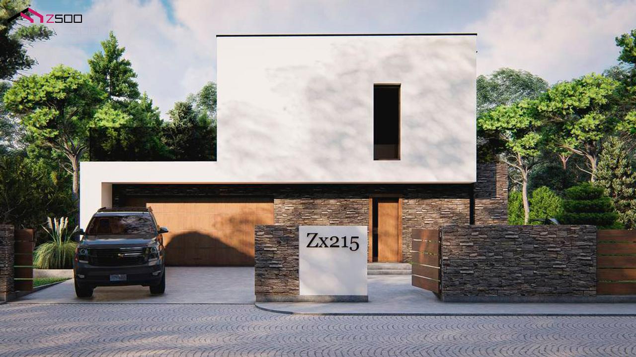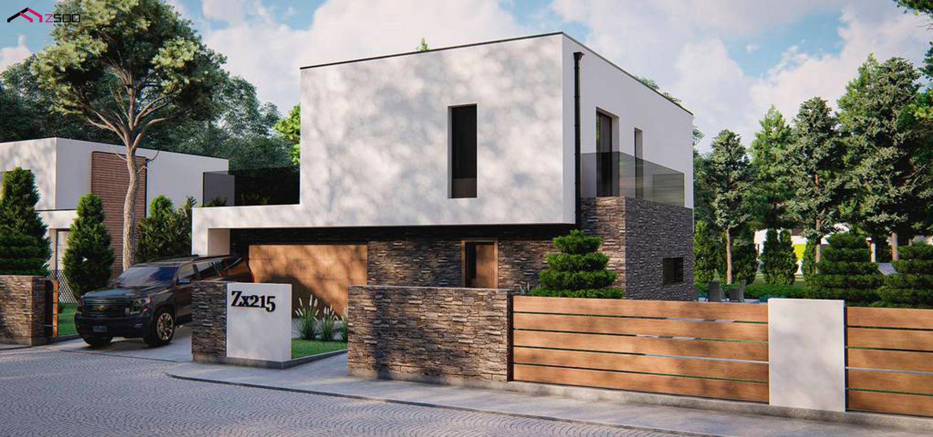 Zx215 представляет собой современный двухэтажный дом с плоской крышей и гаражом на 2 машины, 4 спальни.