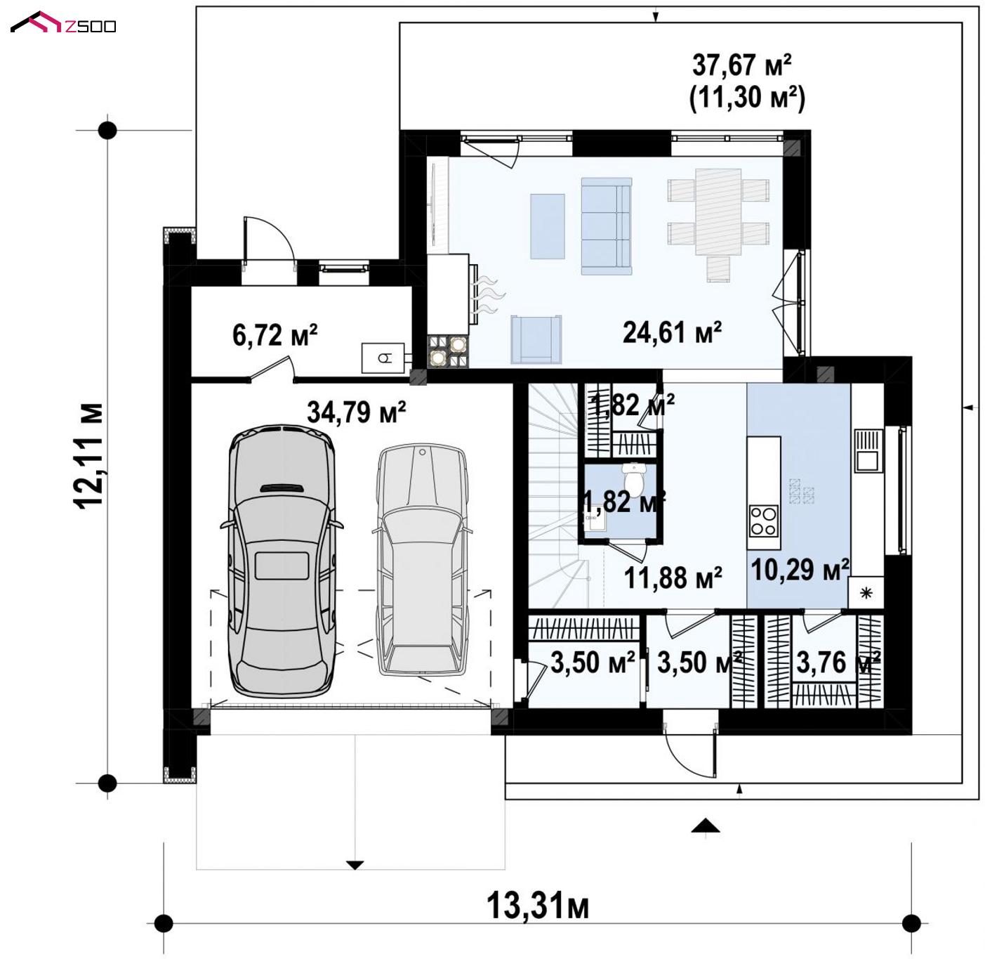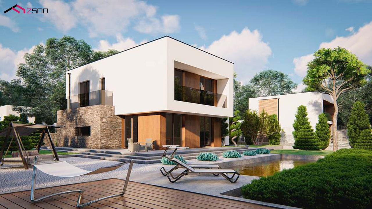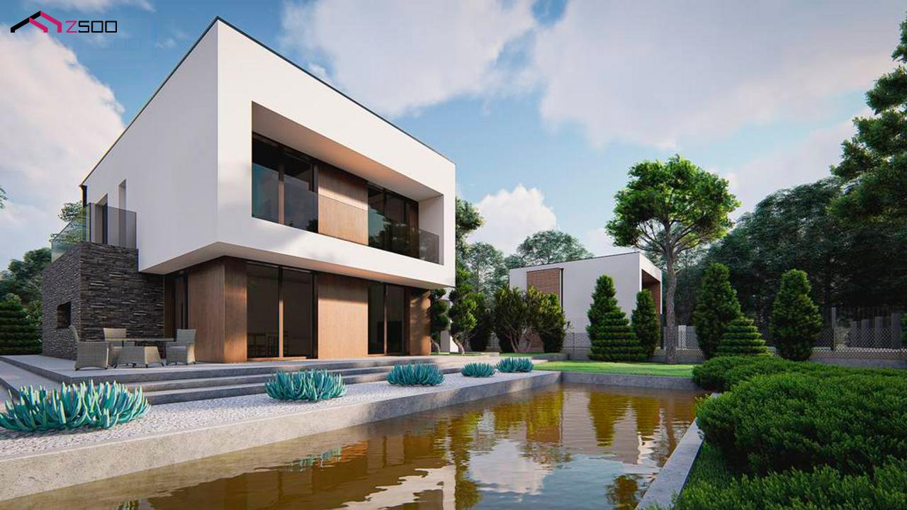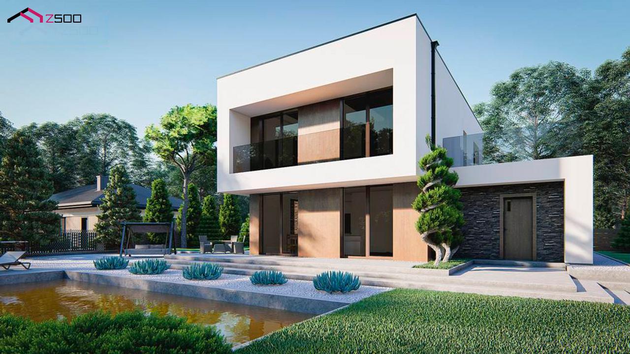 Zx215 представляет собой современный двухэтажный дом с плоской крышей и гаражом на 2 машины, 4 спальни.