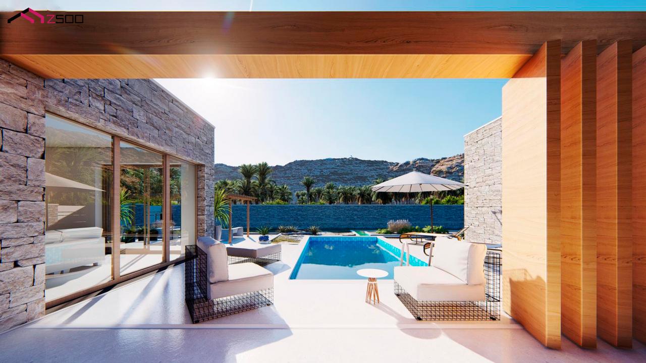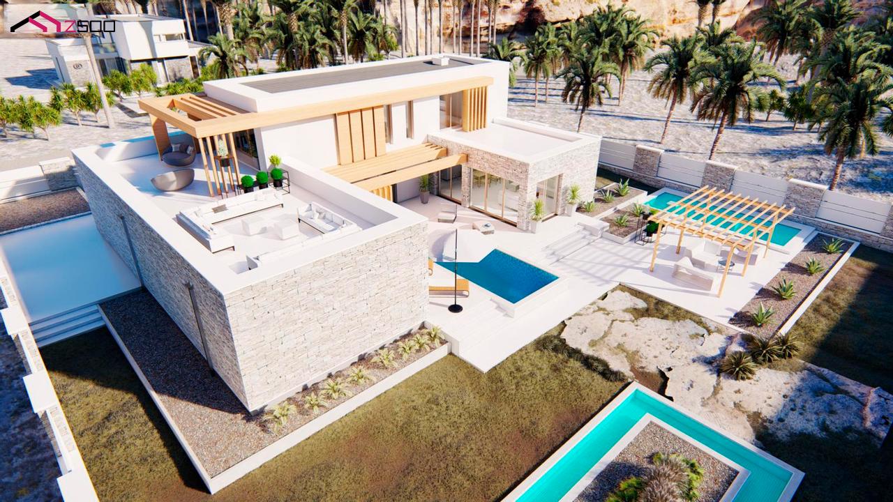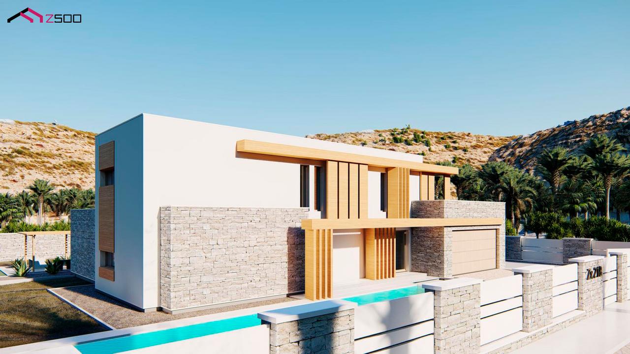 Двухэтажный дом с плоской крышей, с большим остеклением, террасами и гаражом