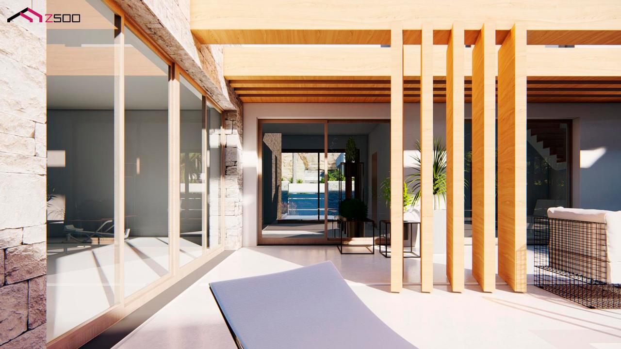 Zx218 – двухэтажный дом с плоской крышей, с большим остеклением, террасами и гаражом.