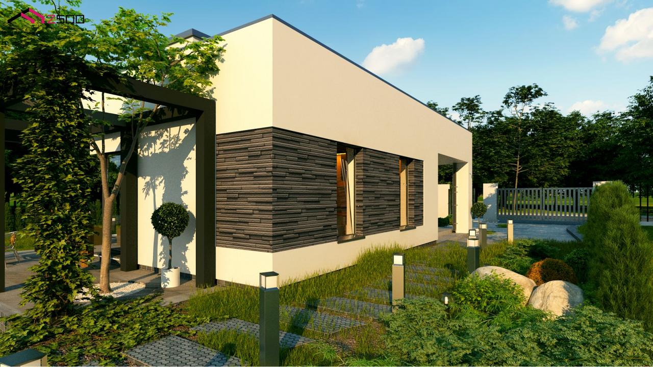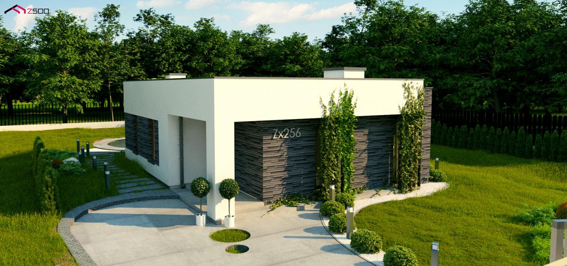 Zx256 представляет собой небольшой современный одноэтажный проект дома с плоской кровлей.