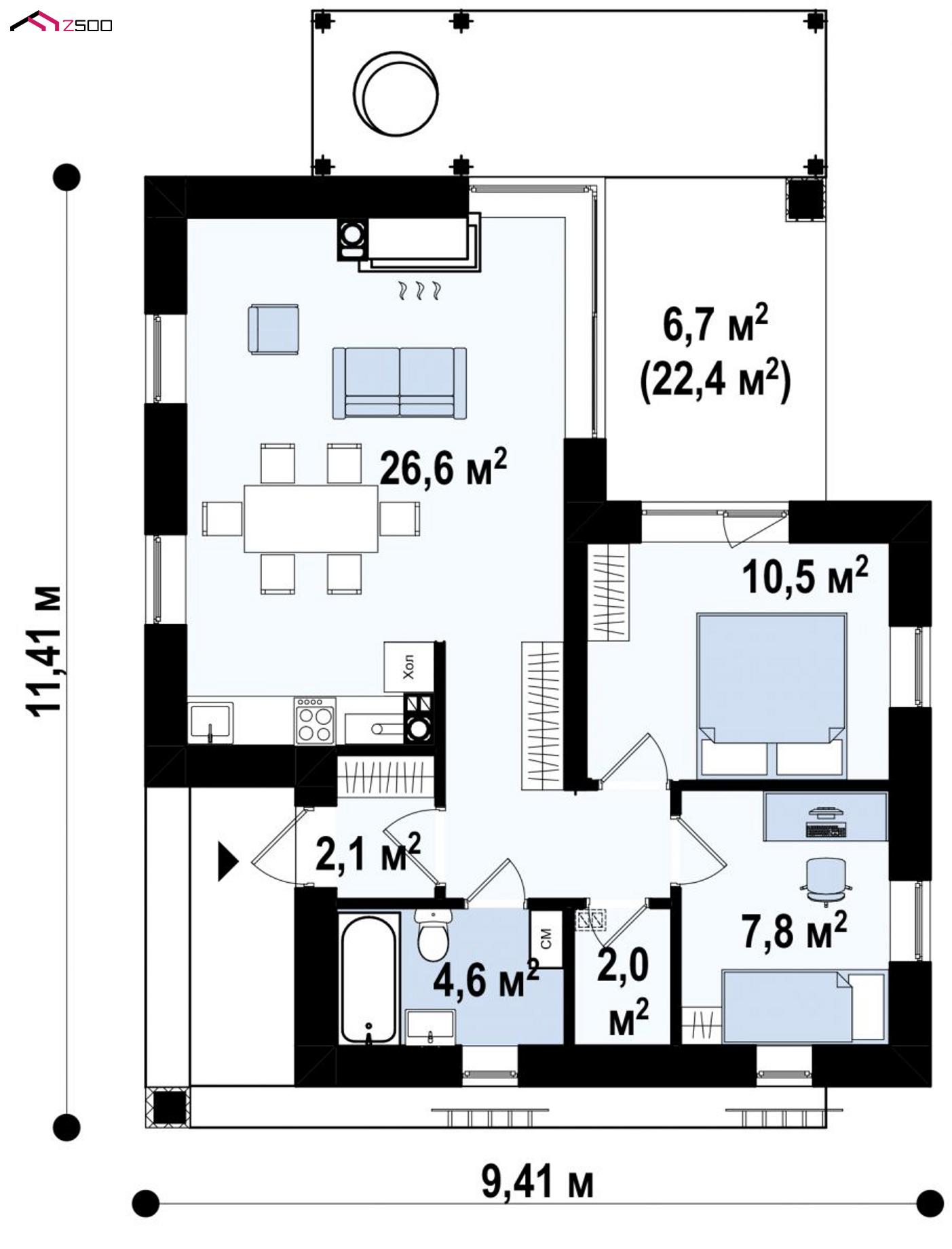 Проект Zx256 – отличная идея для дачного или гостевого дома. С комфортом в таком доме может проживать и небольшая семья. В нем есть все необходимое для круглогодичного проживания.