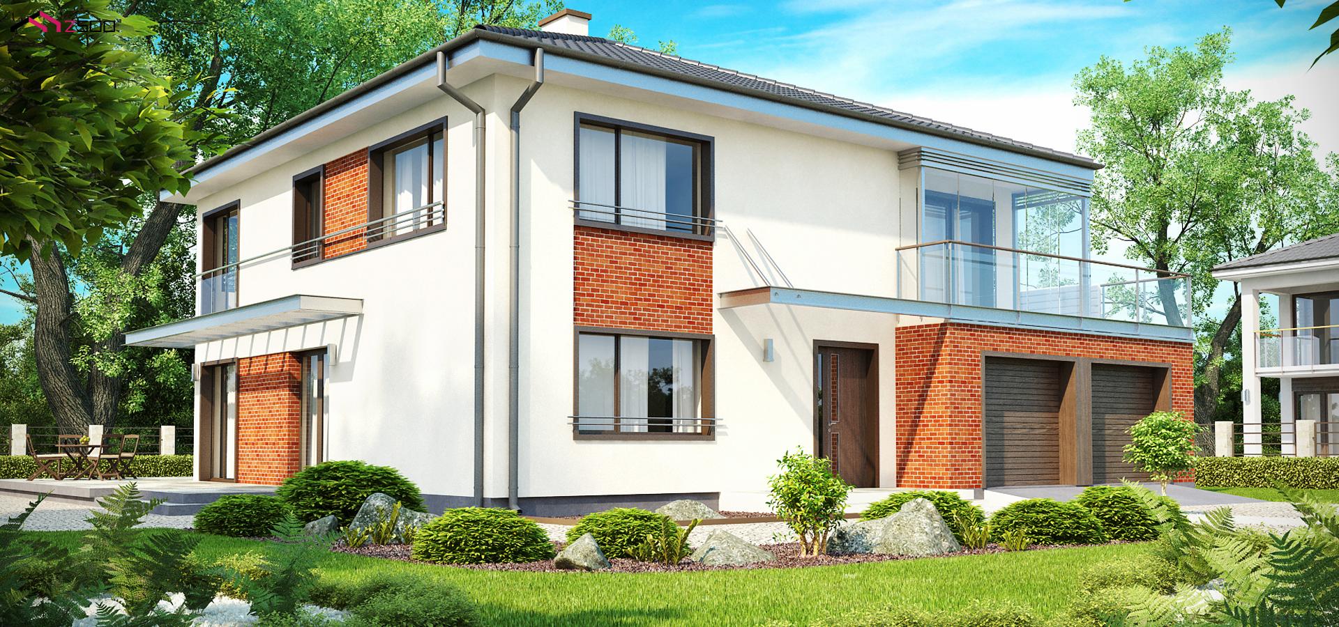 Проект Zx30 представляет комфортабельный двухэтажный дом простой формы со стеклянным эркером над гаражом. Необычное оформление фасада придаёт облику современное звучание: вставки кирпичной кладки, соединяющие окна первого и второго этажа, визуально расширяют площадь остекления, создавая впечатление лёгкости.