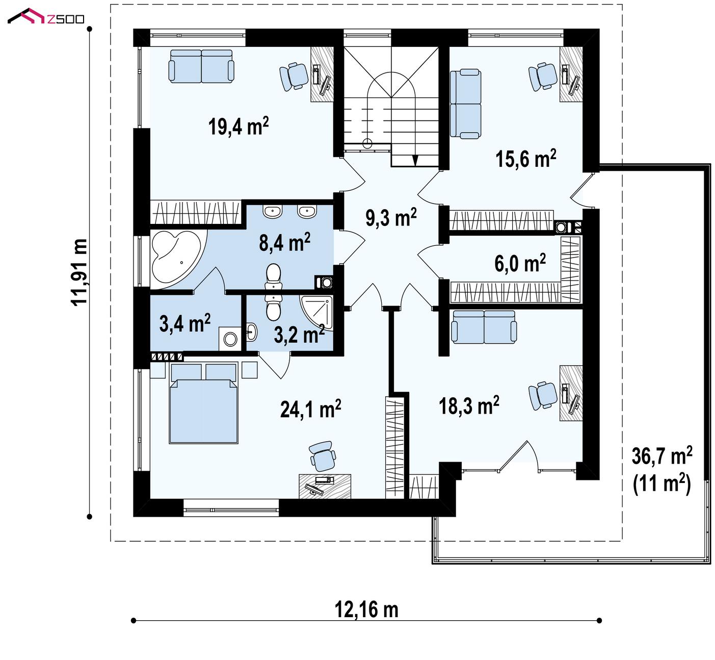 В ночной зоне второго этажа спроектированы четыре спальни, общая гардеробная комната и просторный блок, включающий ванную и прачечную. Подлинное украшение проекта — великолепный эркер, спроектированный в одной из спален.