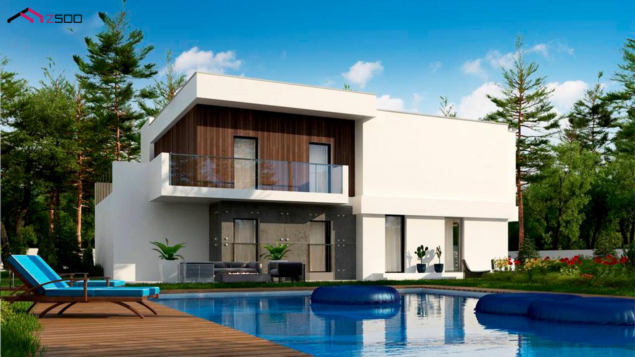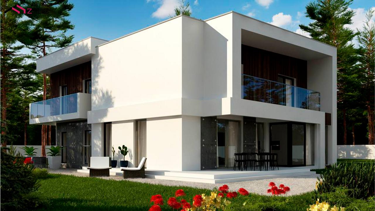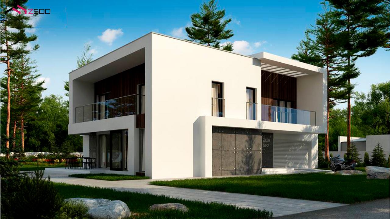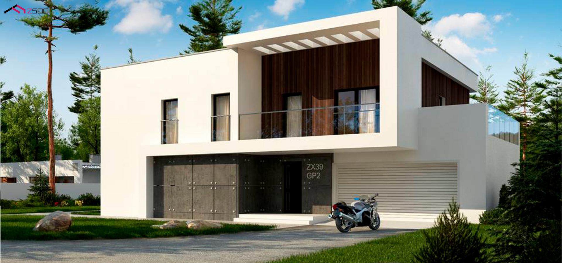 Zx39 GP2 представляет собой двухэтажный дом с плоской кровлей и гаражом на две машины.