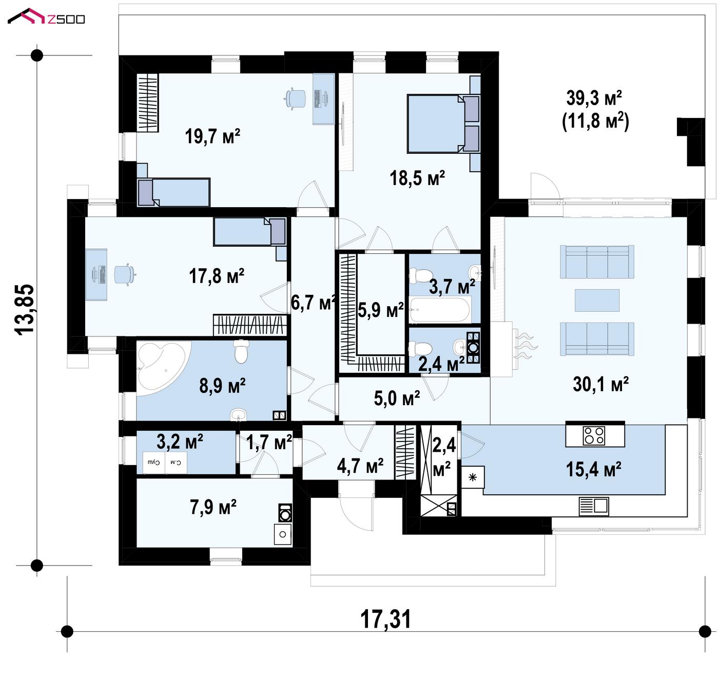Проект Zх56 BG предназначен для ценителей одноуровневых функциональных интерьеров. Дом гармонично смотрится как в городском пейзаже, так и загородом.