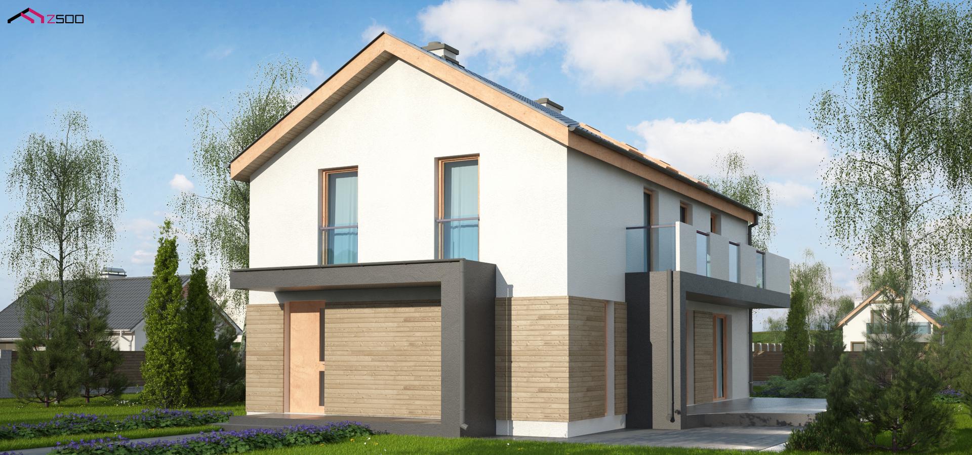 Разработка Zx60 BG представляет версию проекта Zx60 без гаража. Дом простой формы удобен для строительства, и вместе с тем он не выглядит упрощённым. Фасад украшен деревянными панелями, которые подчёркивают вытянутые окна с проёмом от уровня земли. Над элегантно оформленной крытой террасой устроен балкон. Планировка помещений организована по принципу зонирования. Дневная зона сформирована на первом этаже: общее пространство гостиной и столовой отделено от наполовину закрытой кухни. У общей стены устроен камин. Три спальни располагаются на втором этаже (все выходят на общий балкон). В хозяйской имеется просторная ванная и собственный гардероб. Для двух других комнат оборудована общая ванная.