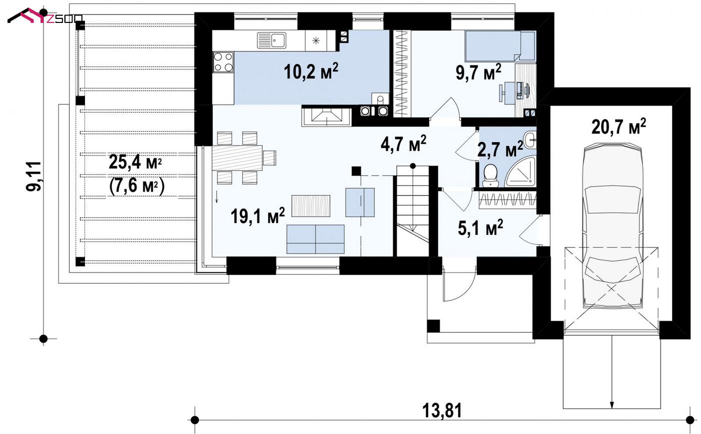 Проект Zx63 по достоинству оценят сторонники современных просторных домов с хорошим освещением. Проект пригоден для реализации в любом пейзаже.
