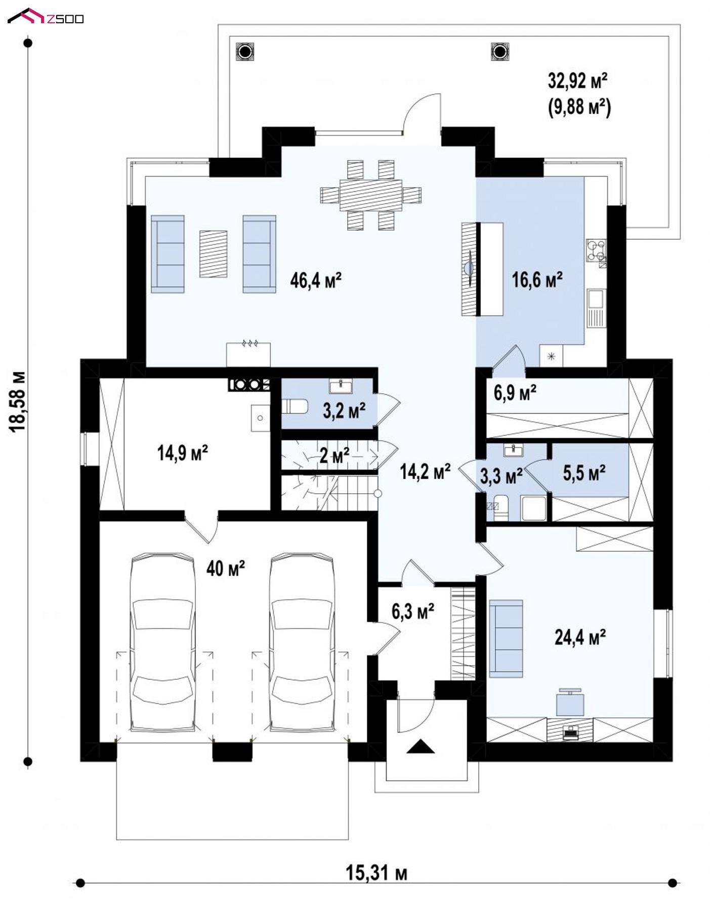| Гостиная+ столовая | 46.4 ㎡ |