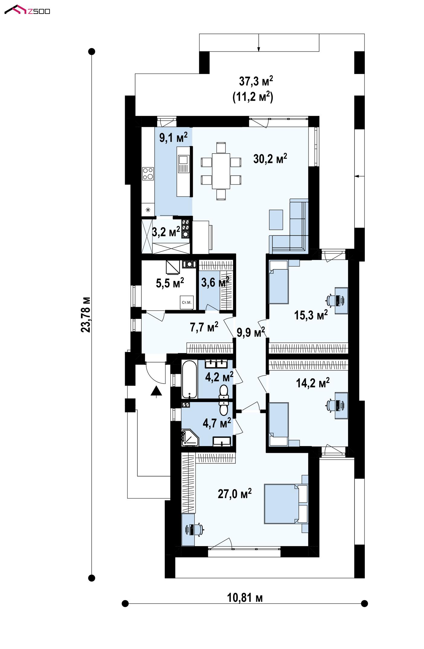 Zx69 v1 – вариант одноэтажного дома Zx69 с плоской крышей.