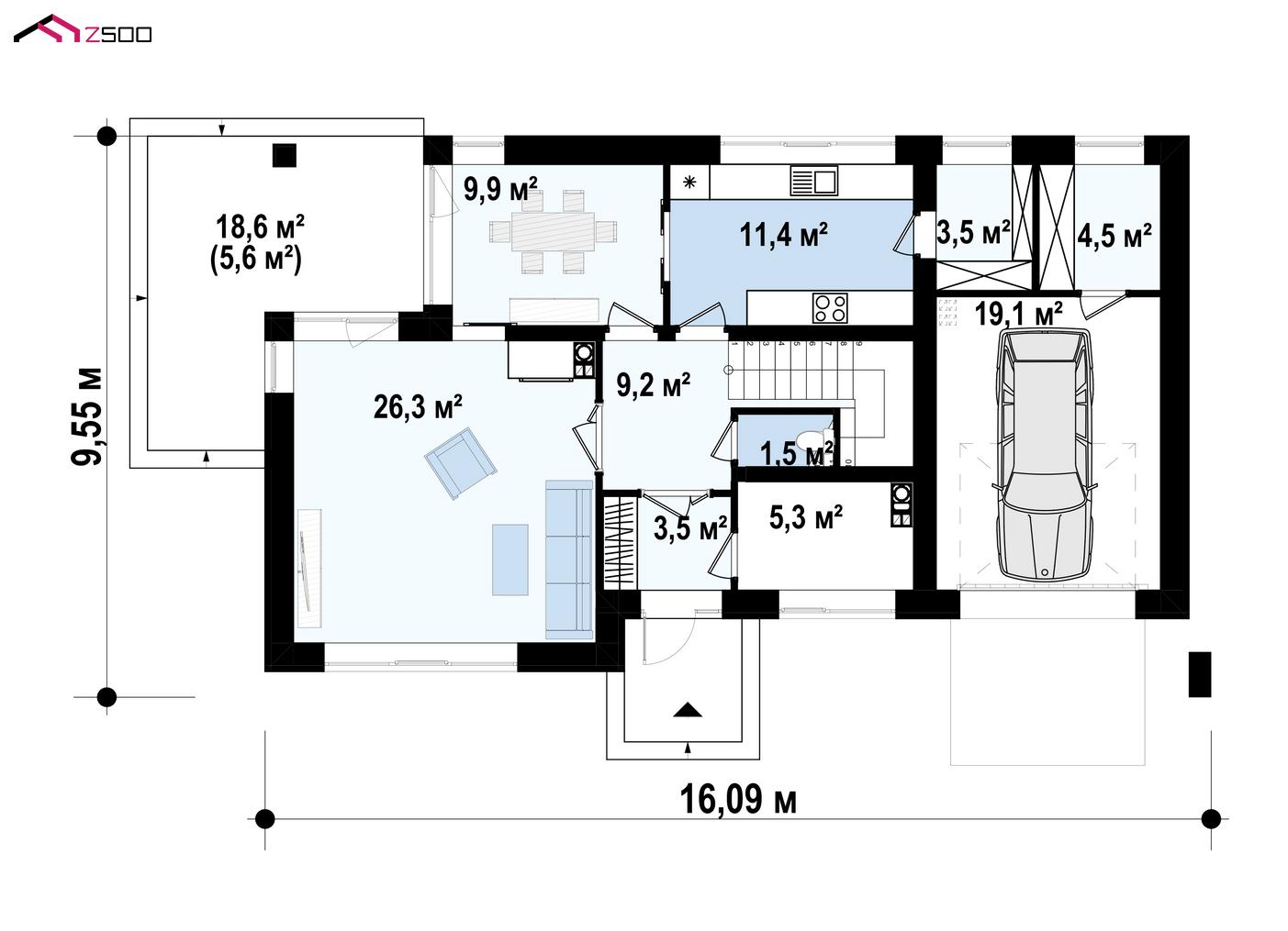 Справа от входа спроектирована дневная зона. Из гостиной есть переход в