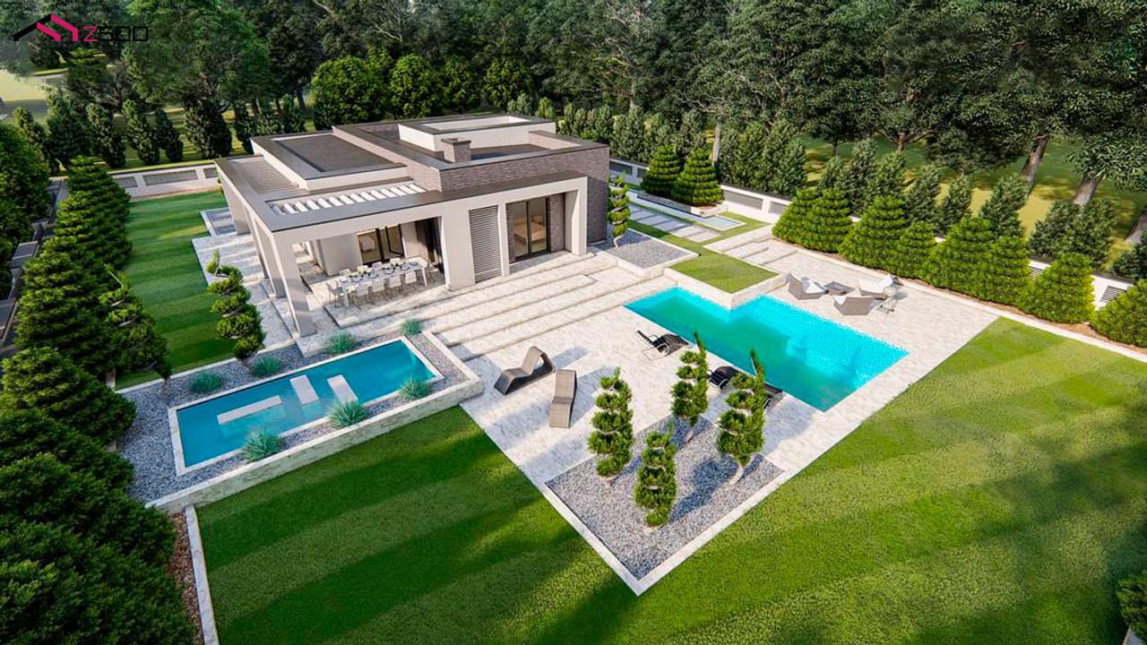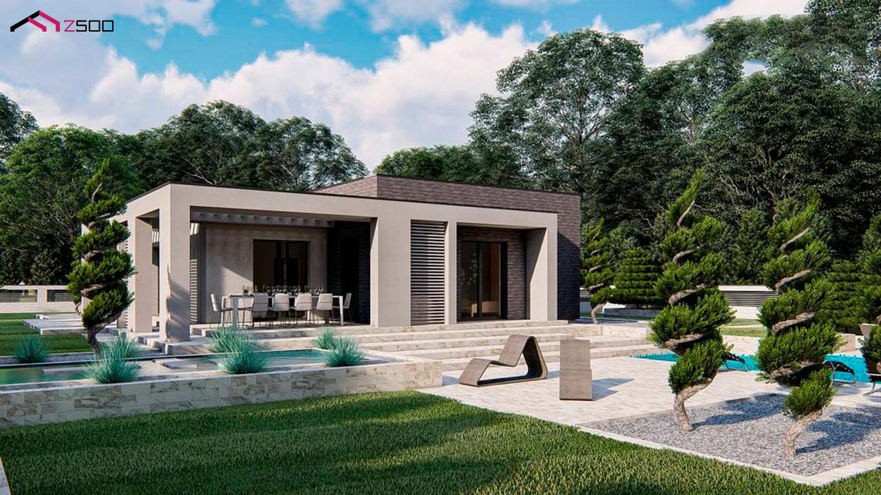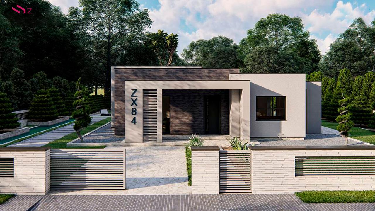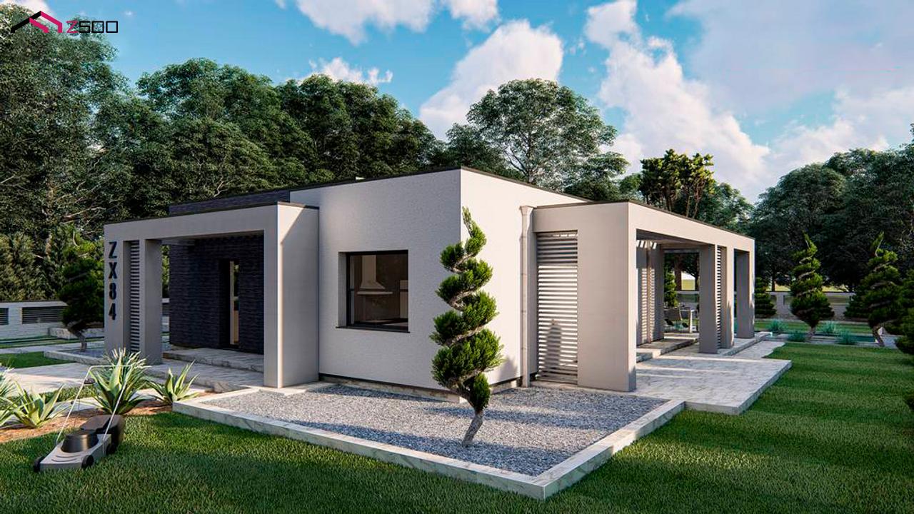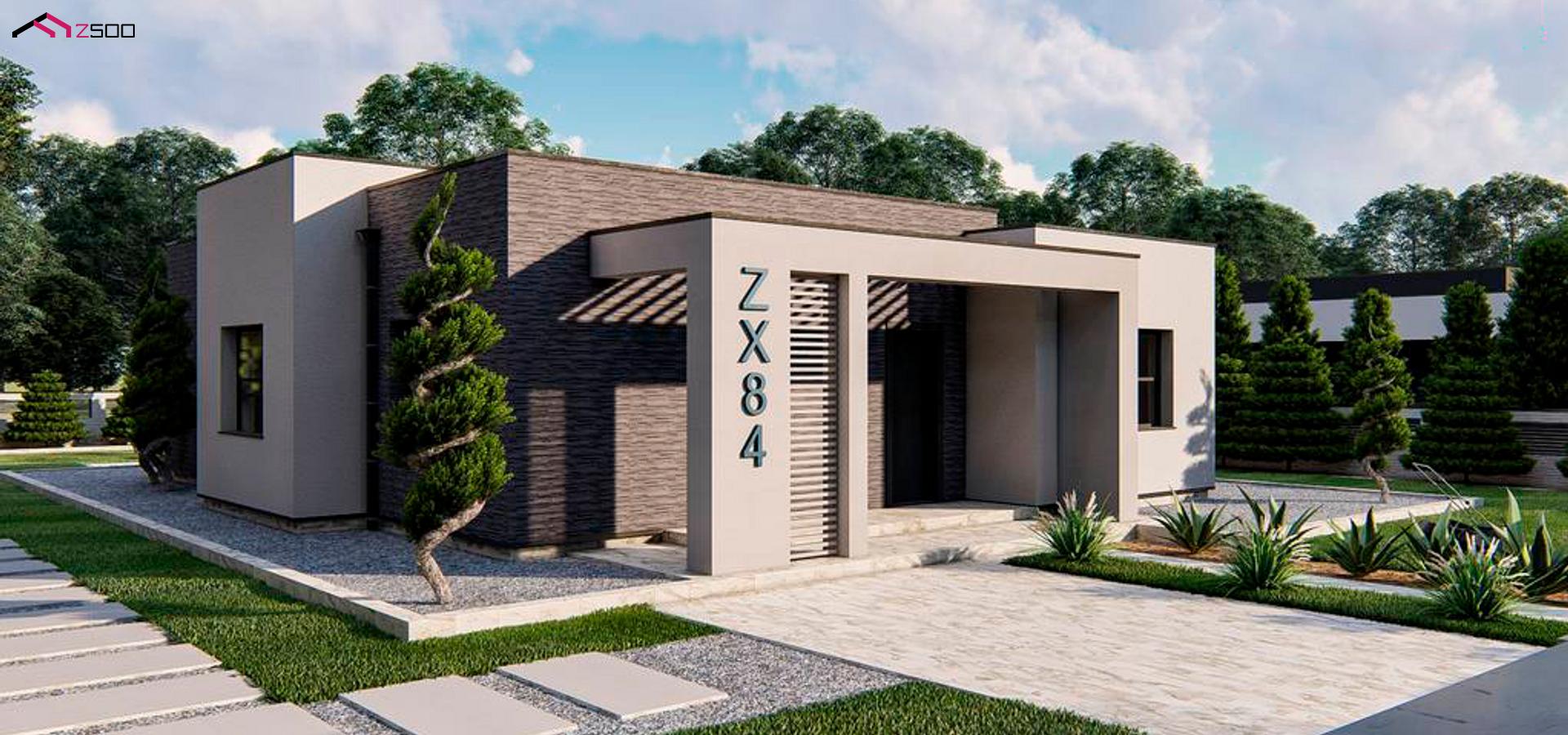 Zx84 представляет собой одноэтажный современный дом с плоской крышей.