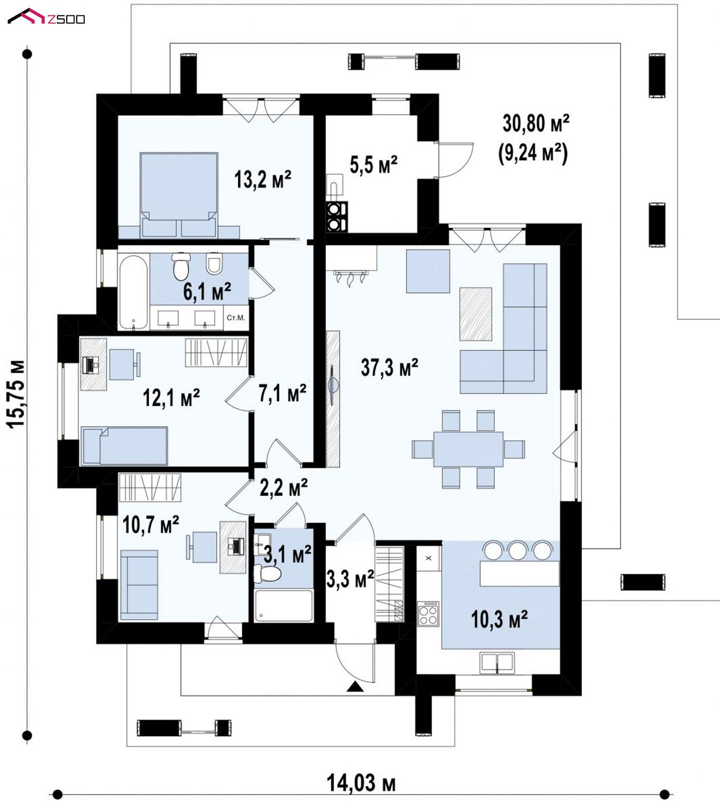 Проект Zx84 – хорошее решение для семей с 1-2 детьми. Грамотная и функциональная планировка обеспечивает комфортное проживание каждому домочадцу.