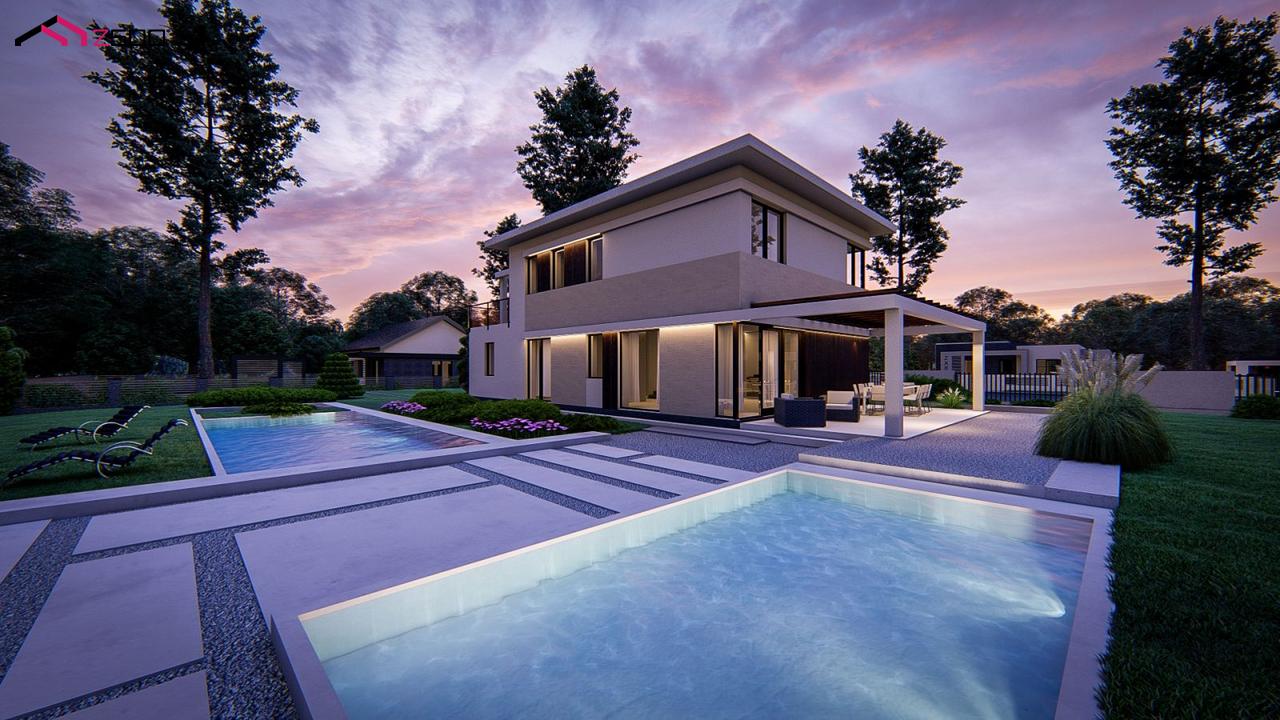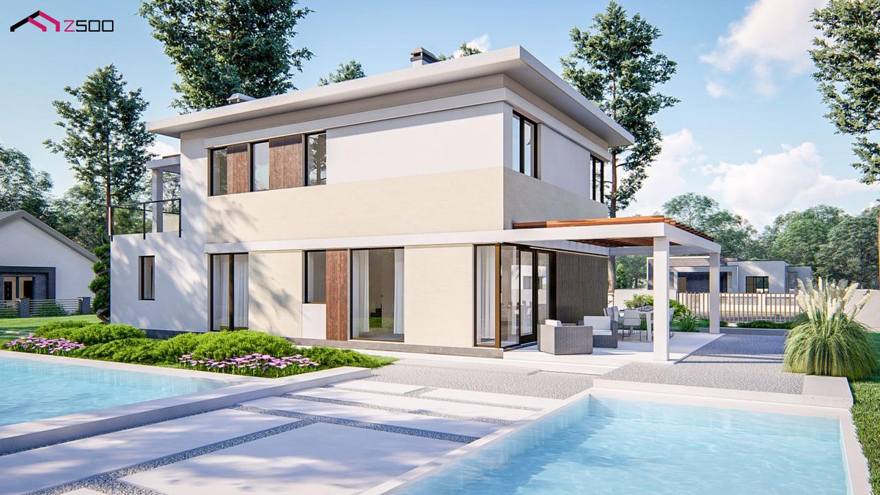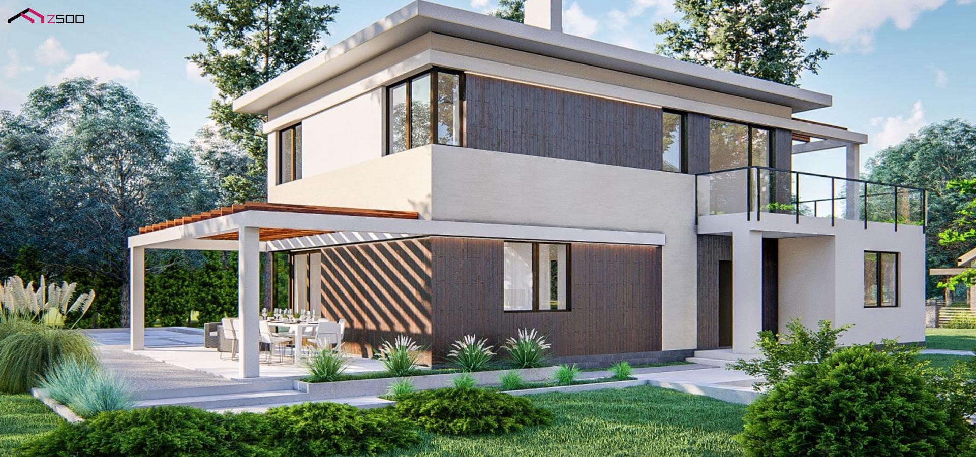 Zz63 B представляет собой современный двухэтажный проект дома с навесом.